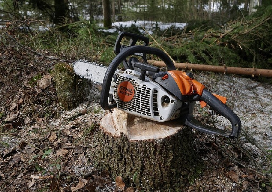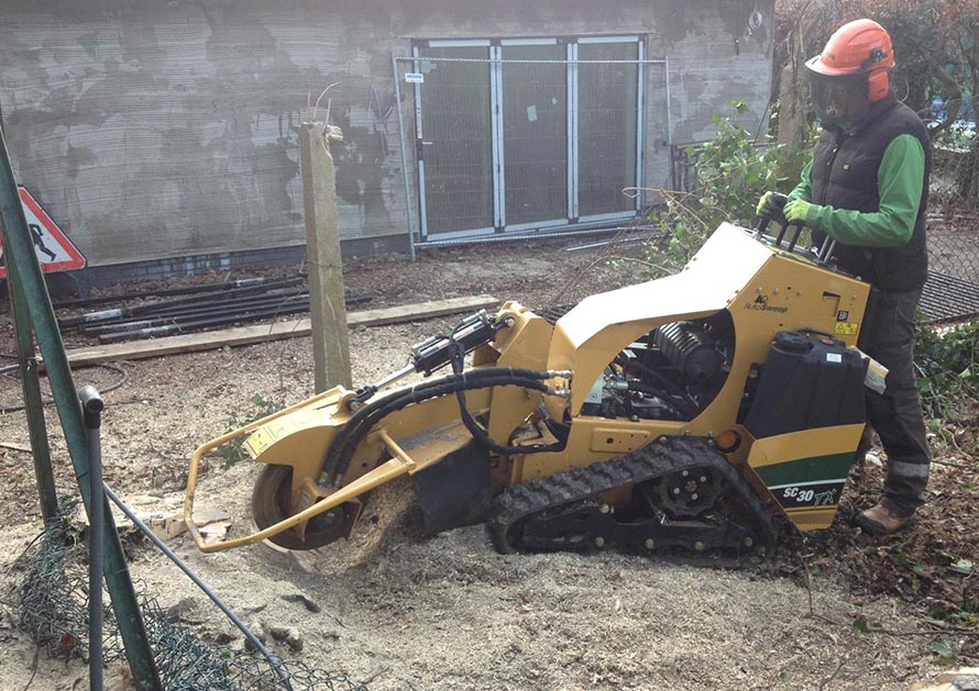 A stump grinding machine is a little bigger than a large lawn mower. It has a wheel with sharp teeth that grind the stump into fine mulch. Stumps are ground 4-7″ below ground level. When finished, the mulch from the stump is raked back into the hole where the stump was and in the place of a stump you have a small bed of mulch.